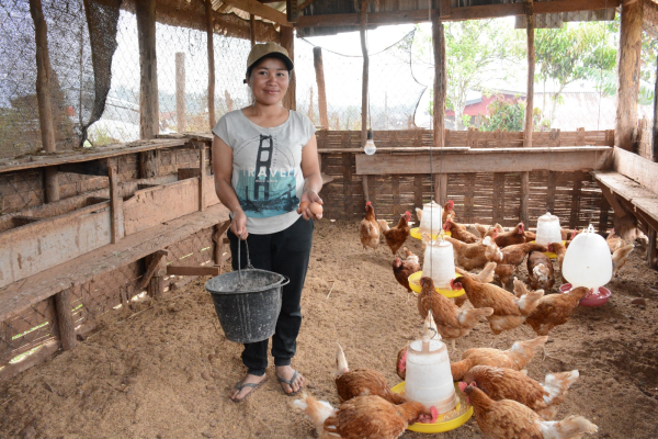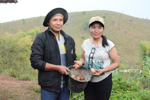 Mr. Somlee Keomany, one of the farmers participating in the poultry activity, said WFP provided him with 50 egg-laying chickens and helped construct a chicken coop. Through training on poultry farming techniques, he has been able to produce eggs for sale at local markets, selling about 20 to 30 trays each month.