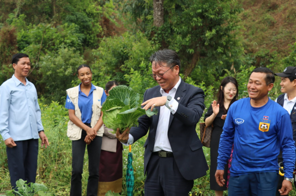 During a recent field visit, an international delegation led by Jung Yung-soo, Ambassador of the Republic of Korea to Laos; Jean-Gabriel Duss, Regional Director of the Swiss Agency for Development and Cooperation (SDC); Björn Schranz, Head of Programme for Climate Change and Natural Environment; and Marc-André Prost, WFP Representative and Country Director in Laos, visited nearby farms in Hua Nam Bak and Houay Tong villages. The delegation observed how local farmers grow vegetables and raise egg-laying chickens to supply ingredients for school meals.