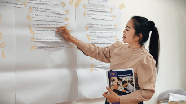 Script writers from the TTC discussing signs teachers could observe to identify learning difficulties.
