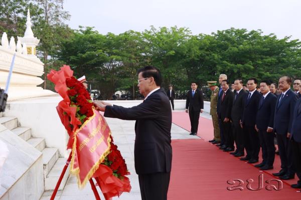 Floral tributes were laid at the Unknown Soldiers Monument in honour of fallen heroes. Leaders also placed flower baskets before the statue of Kaysone Phomvihane at the Kaysone Phomvihane Museum, paying tribute to his enduring legacy and leadership.