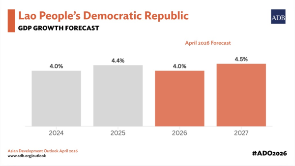 Economic growth in the Lao People’s Democratic Republic (Lao PDR) is projected to slow to 4.0% in 2026, down from 4.4% in 2025, before picking up again to 4.5% in 2027, according to the Asian Development Outlook (ADO) April 2026 released today by the Asian Development Bank (ADB). Growth is expected to be supported by services, power generation, construction, and regional connectivity, amid elevated external risks.