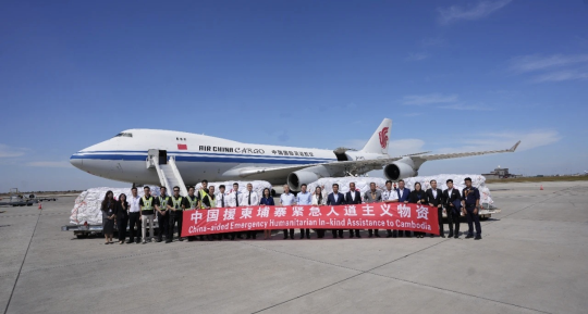 ເຄື່ອງຊ່ວຍເຫລືອ ດ້ານມະນຸດ ສະທຳ ຊຸດທຳອິດ ທີ່ລັດຖະບານຈີນ ຊ່ວຍເຫລືອ ສຸກເສີນໃຫ້ ກຳປູເຈຍ ເຊິ່ງລວມມີ ຜ້າເຕັ້ນ, ຜ້າຫົ່ມ, ອາຫານ ແລະ ອື່ນໆໄດ້ຂົນສົ່ງໄປເຖິງ ສະໜາມບິນສາກົນ ເຕໂຊ ນະຄອນລວງ ພະນົມເປັນ ຂອງກຳປູເຈຍ.