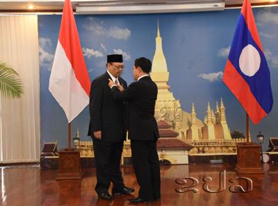 (KPL) Minister of Foreign Affairs Saleumxay Kommasith, representing the government of Laos, pinned a Friendship Medal on outgoing Indonesia Ambassador to Laos, Mr Irmawan Emir Wisnandar, in recognition of his contributions to strengthening the friendly relations and cooperation between Laos and Indonesia.