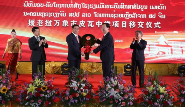 (KPL) Phia Wat Secondary School, newly built with a grant support of 97.4 million yuan from China, was handed over to Lao authorities on Mar 30 in the presence of Deputy Prime Minister and Minister of Foreign Affairs Saleumxay Kommasith and Chinese Ambassador to Laos Jiang Zai Dong, teachers and students of the school.